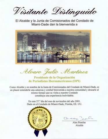 Desde la fundación de la Organización de Periodistas Iberoamericanos en 1997 se ha realizado una extraordinaria labor que no ha pasado desapercibida por personalidades de diversos sectores de la comunidad internacional, quienes estimulando nuestro trabajo han otorgado reconocimientos a la institución, entre los que podemos mencionar la proclama entregada a la OPI por el ciudadano Alcalde del Condado Miami Dade, Florida, USA, Dr. Alex Penelas, quien declaró el día 27 de marzo como Día de la Organización de Periodistas Iberoamericanos en la ciudad de Miami, e hizo entrega al comité ejecutivo de la entidad gremial de una proclama del Condado. Reconocimiento que nos recuerda y obligan el compromiso de defender los intereses del gremio periodístico.