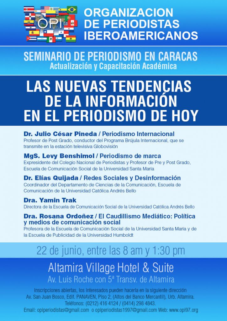 El 7 de noviembre de 1997, periodistas de trayectoria nacional e internacional, asumieron la vanguardia para la gestación de una organización en donde coincidieran los mejores criterios en pro de un periodismo libre, digno y responsable, produjeron el documento génesis de la OPI, cuyo texto fue refrendado en la VII Cumbre Iberoamericana de Jefes de Estado y de Gobierno por 40 comunicadores presentes, y representantes de 21 países, quienes hoy, son soportes del ente que nos honra a todos. Desde el mismo momento en que se materializa esta iniciativa del periodista venezolano Alvaro Julio Martínez, se produjo una suma de voluntades que se concretó con la firma del acta constitutiva de la institución, que representa la base legal que nos ha permitido estar presente en todos los espacios de nuestra competencia.
