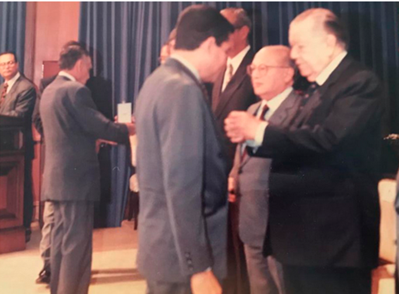 Pie de foto: El jefe de Estado venezolano doctor Rafael Caldera impone la condecoración Francisco de Miranda al presidente de la Organización de Periodistas Iberoamericanos, Álvaro Julio Martínez, en acto realizado en el Palacio de Miraflores, con motivo de la celebración del Día del Periodista en Venezuela, en 1997. OPI.